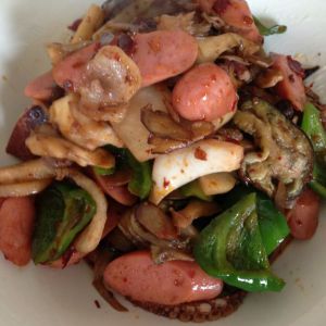 五花肉切片,锅中倒适量橄榄油,放入蒜片五花肉,直至肉片耗出油分,肉片拨至一边,下蘑菇青椒一起翻炒断生。中途加鱿鱼须、火腿、茄子一起翻炒。