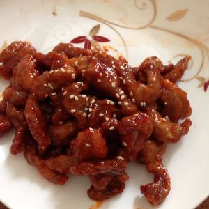 留底油加入番茄酱,食醋,白糖烧开后,加入肉丝点几滴水淀粉使每根肉丝都裹上酱汁就可以出锅了。