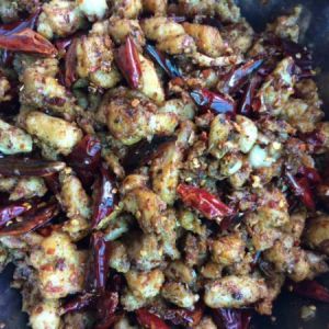 干辣椒剪成小段,放入锅中,加辣椒粉、花椒粉、盐、蒜末、姜末,用油爆香,再倒入炸好的鸡腿肉,反复翻炒均匀