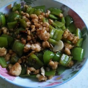 锅热后,倒入多点油,把鸡丁炒制一下,把鸡丁放到一边,重新放入花椒和辣椒段,放入葱丝姜丝,放入尖椒,炒制一分钟。之后放入炒制好的鸡胸肉。煸炒之后,放入耗油,适量酱油,放入盐,味精。出锅咯。