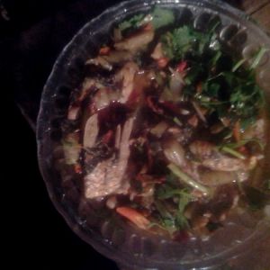 我弄了一份辣的一份不辣的,辣的我用热油炒郫县豆瓣酱浇在上面,最后撒些香菜!
