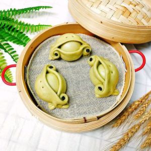 21 做好造型的小青蛙 放入笼屉 用裱花针在蛙嘴上边扎出鼻孔做装饰 锅里放温水 盖上盖子 30度°左右发酵50分钟
