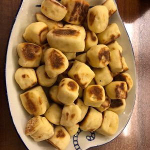 平底锅中加入少量,一定是少量的油,也可以用刷子薄薄的涂一层油。待油温升高后放入面丁子,像烙饼一样一面熟了就可以翻身啦。定型后用铲子翻炒均匀,熟了就可以出锅啦。