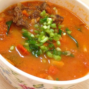 我是耐着性子炖了四个小时,番茄完全炖化,呈番茄酱状,快起锅时加入切成段的葱稍微煮一下,加盐调味,出锅,端上桌前撒一点葱花