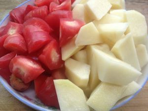 将烧排骨用的配菜切块备用,配菜可以根据个人的口味选但是土豆是必须要有的。