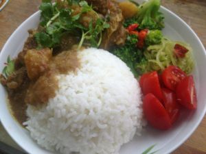这就是最后的成品咖喱排骨饭,我还配了一道枸杞炒西兰花和一点凉拌的青笋丝。