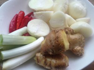 葱、姜、蒜、红辣椒备用