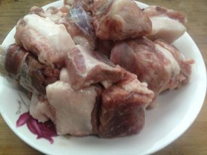猪肋排洗净斩成2指宽小段,用加入少许白醋的温水侵泡越10分钟后捞起备用。