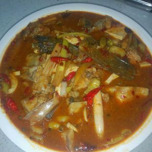 将锅中倒100克清油,待中温的时候将辅助作料和鱼底料放入锅中,然后倒清水,500克