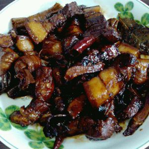 待肉块都裹了糖浆且都金黄,撒入十几粒花椒,放入蒜瓣,姜片,两颗八角,随意数量的干辣椒,翻炒几下,出香,倒入老抽,红腐乳汁,料酒,翻炒均匀,倒入没过食材的开水。大火煮开转中小火慢炖。我有加盖。