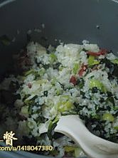 电饭锅中依次加入腊肠、青菜,再稍加些盐,否则出来的饭太淡,就没味了。