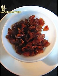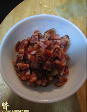 锅中水烧开,把腊肠蒸熟,至透明状。