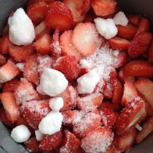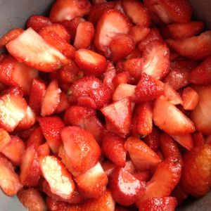 草莓洗净去蒂切块,一层白糖一层草莓。
