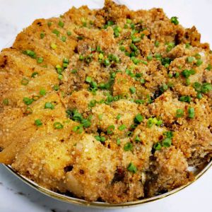 五花肉切片排骨剁小块用蒸肉粉码味一小时,荔浦芋头切块(也可以是土豆、红薯、南瓜等自己喜欢的根茎类配菜)粉蒸肉粉加点开水调匀,加入芋头切均匀搅拌(确保每块都裹上粉)然后放到盘子底部,五花肉、排骨码上面
