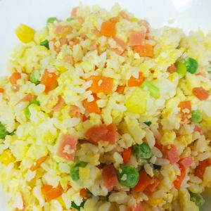 炒到米饭外面的蛋液凝固的时候,把之前焯过水的蔬菜粒和火腿肠丁倒进去翻炒几下。