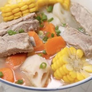 3.开盖,放莲藕块、玉米段、胡萝卜块,继续炖煮半小时。
