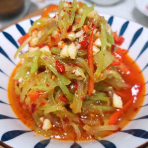 莴笋丝挤干水份,加蒜末,大红辣椒丝,辣椒粉,盐,味精,白糖,锅内烧少量油,油热淋上去