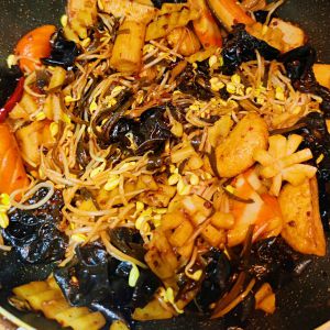 喜欢的菜品通通扔里面,翻炒均匀就好。