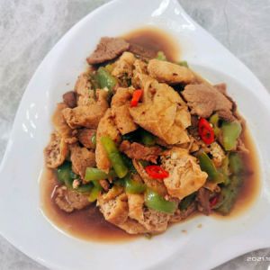 瘦肉切片,青椒切丝,油豆腐一个可以切三片,这样烧起来更入味。