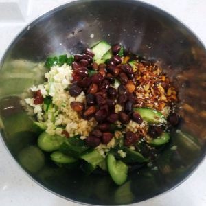 之后再放入盐,蒸鱼豉油,麻油,醋和香油,但是先不要搅拌。