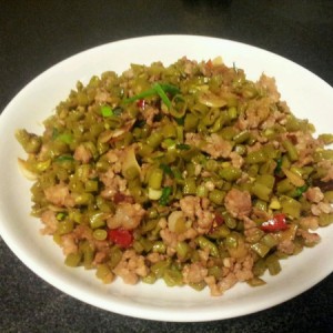 酸豇豆下锅和肉末一起翻炒 炒熟后放入清蒜苗继续翻炒 起锅前在放入鸡精粉