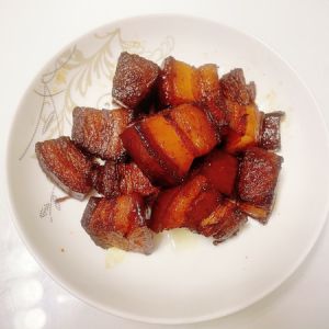 起锅,中小火热油,放入冰糖慢慢搅拌至融化、变色后,放入肉翻炒。