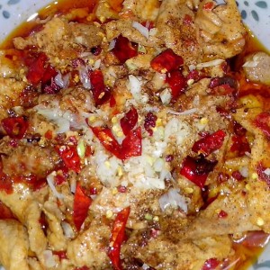 葱、姜、蒜剁成末和花椒、干辣椒放在肉片上,炒锅烧热油倒在料上,出现噼噼啪啪的声音,大功告成!