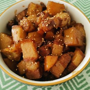 新鲜五花肉切块加生抽2瓷勺,老抽1瓷勺,耗油1瓷勺,料酒2瓷钱腌制30分钟以上。(时间允许的话,可以包上保鲜膜放冰箱冷藏过夜)