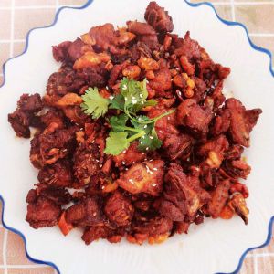 少许底油加入灯笼椒炒香在加入配料葱段姜片蒜子麻椒干辣椒炒香,接着放入鸡块辣椒粉小火煸,再加白糖和盐煸一会最后加香油完成。