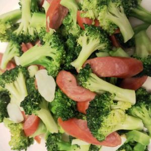 蒜切片,油热后放入锅中煸炒至微黄后加入西蓝花和火腿肠,翻拌均匀加入少许盐,淖水时已加过盐此时不用太多。