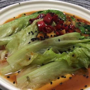 生菜沸水中不要焯太熟,叶软、干待生脆,即可起锅,装盘中,让它继续等待;