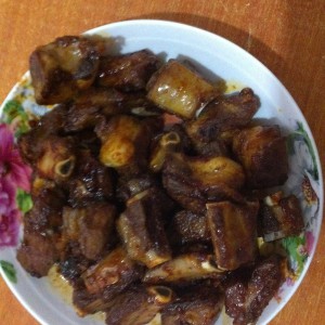 倒入汤汁儿熬至稍粘稠的时候把排骨放在锅里煸炒,直至汤汁儿都被排骨吸收后关火、装盘