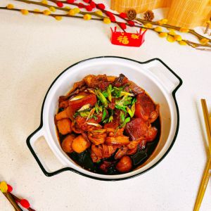 小火烧至40分钟后加入打好的百叶结,放入少许冰糖和醋,然后再烧15分钟后收汁,淋上少许香油