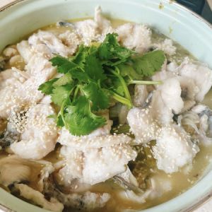 鱼片另外起锅,浮起捞出,放在最上面。洒上芝麻香菜。
