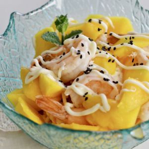 大虾,蟹肉棒,芒果,放在碗里,挤上色拉酱,撒上芝麻
