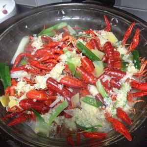 小龙虾去头,抽虾线,背壳剪开一道口(后来发现口子剪宽点,大约6mm就更好了,当时我只剪了一条口。。。以后改正)加盐、鸡精和料酒腌制30分钟,腌制过程就可以准备辅料。