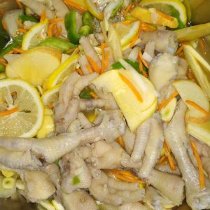 鸡爪剪去指甲,最好是剁成一小块一小块的,那样更入味,我手受伤了就没有剁开,凉水下锅煮17分钟左右,然后用纯净水浸泡,中间再换一次水,直到凉透了为止,这样吃起来脆脆的