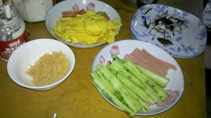 煮饭的同时把鸡蛋摊成蛋皮,黄瓜去皮切成长条,火腿,胡萝卜也切成条,香菇去蒂切成条,焯熟待用