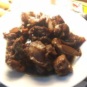 冰糖熬化以后加入煮好的排骨一起翻炒,使每一块排骨都均匀的裹上糖色