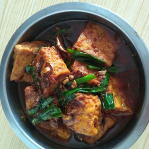 加水,水开后放煎好的豆腐一起煮,差不多快好的时候放葱段烫一下,放鸡精,然后就可以出锅了