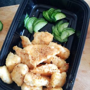 锅中少许油,小火。鸡肉沾面包糠然后入锅煎制两面金黄。然后倒入调好的料汁,大火收汁
