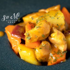 如图将鸡腿肉去骨切成块状,洋葱切块,土豆、胡萝卜切滚刀块备用。