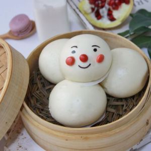 取出后可以用黑色色素笔在馒头上画出面包超人的眼睛、眉毛和嘴巴即可