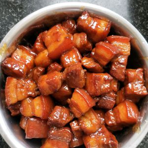锅里热油放入冰糖用铲子不停搅动,当冰糖出现小泡泡时倒入焯好的五花肉
