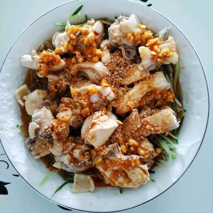 蒜末,生抽,耗油,白糖,盐,芝麻,还有刚刚的红油混合,还要加上半碗煮好的鸡汤