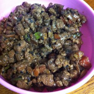 锅倒油烧热,可以多放油,先把鸡蛋炒碎;盛出,再放点油,把大葱和洋葱丁放进去炒一会儿,再放胡萝卜丁翻炒,然后放肉丁继续翻炒,等肉变白时放入拌好的酱和鸡蛋碎翻炒至酱色均匀。