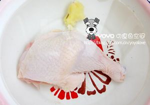 鸡腿去掉皮下脂肪,飞水(就是把鸡腿跟加了姜的冷水一同煮到滚,再捞出)