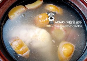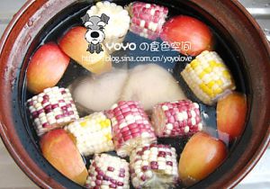 把飞过水的鸡腿和玉米、苹果,加上2000g的水一同下入瓦煲