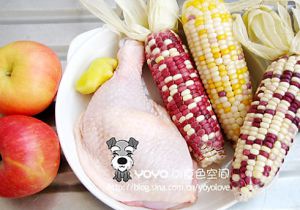 准备原料:苹果2个、玉米3只、鸡腿一只、姜一块