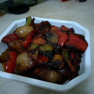 6.最后把五花肉倒入锅里和辣椒胡萝卜一块炒,起锅之前放入上面的各种调料,然后再翻炒几下就可以起锅了。